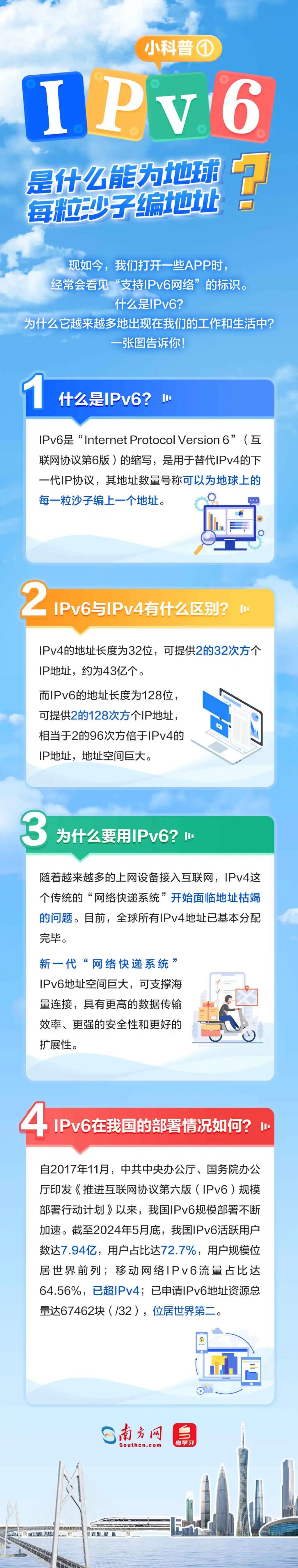 什么是IPv6?它對我們來說有哪些好處?廣東IPv6部署取得了哪些成效,為哪些行業帶來了改變?部署IPv6又有哪些關鍵步驟?5張圖帶你看懂這個能為地球每粒沙子編地址的神奇技術!